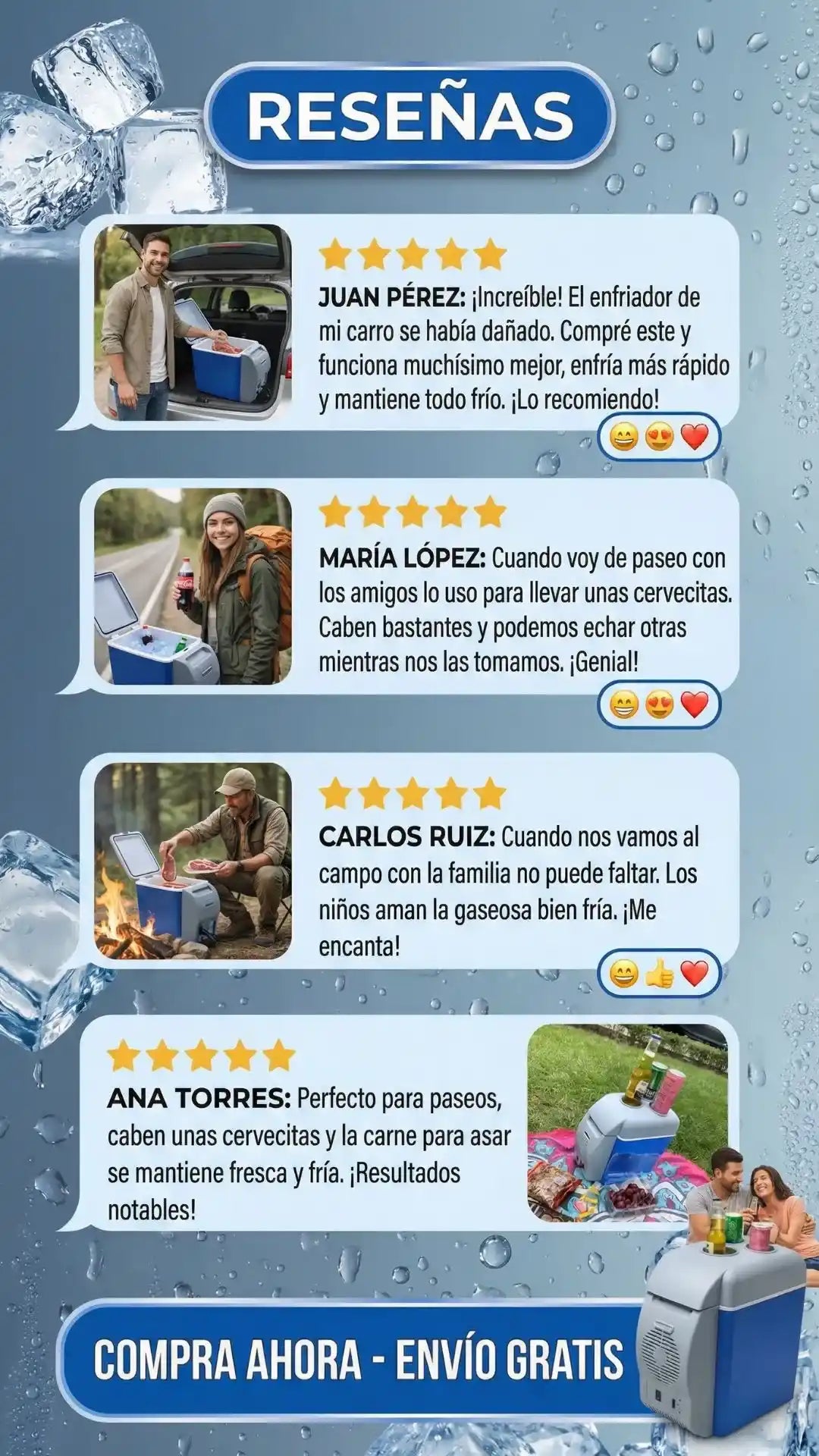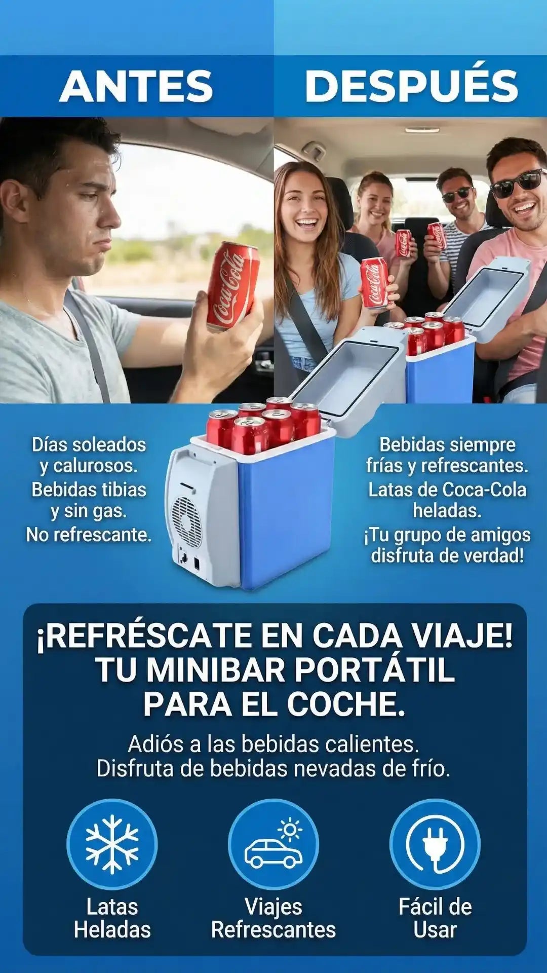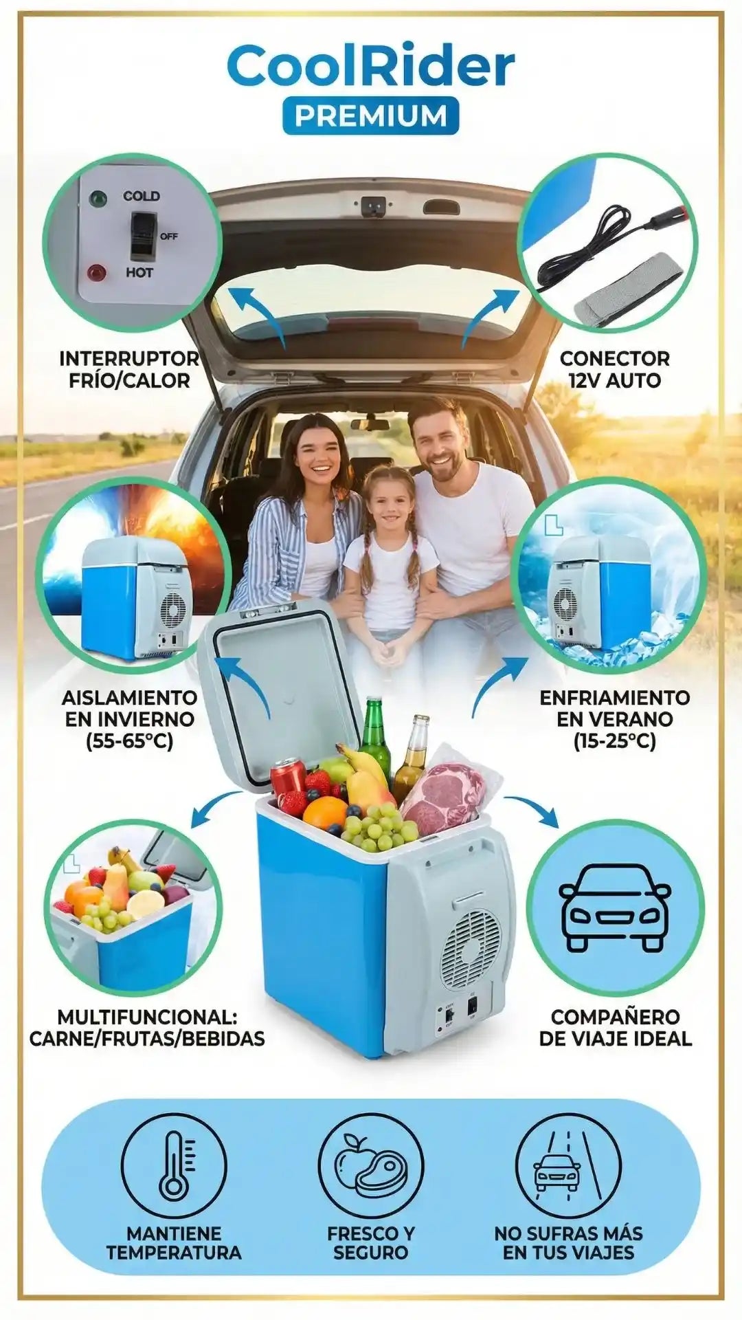 Tiene una capacidad de 7.5 litros, ideal para llevar varias bebidas, frutas, snacks o alimentos pequeños durante viajes, camping o uso diario en el carro.