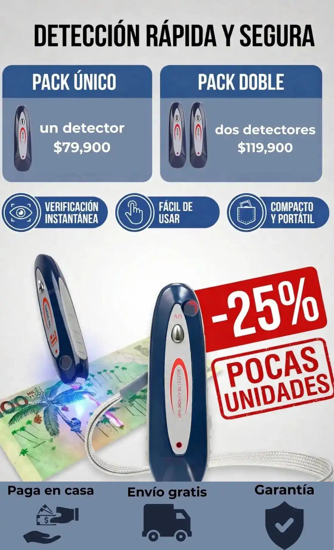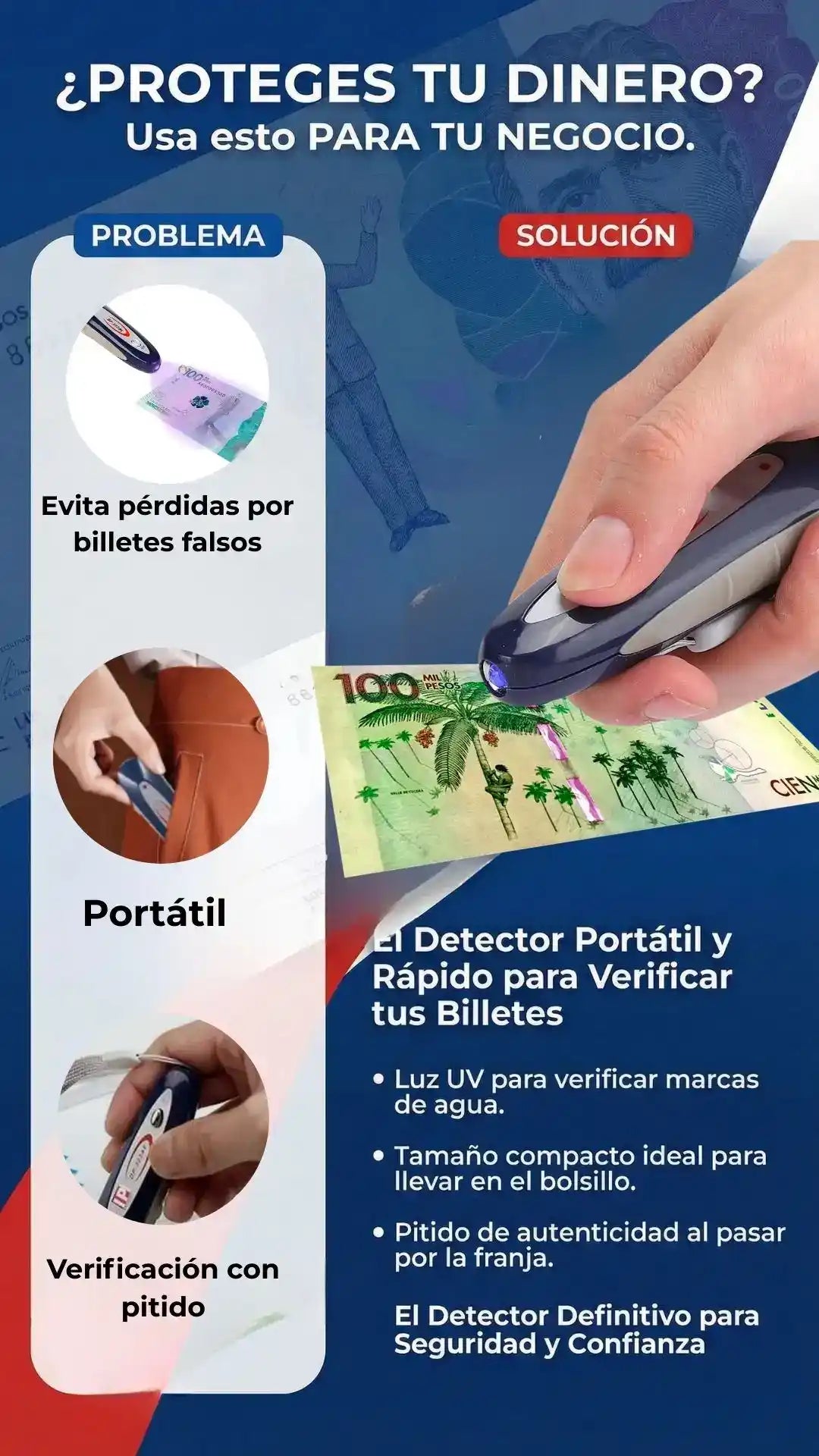 El detector usa tecnología UV (ultravioleta) y magnética para identificar marcas de seguridad que solo están en billetes auténticos, ofreciéndote una verificación rápida y confiable.