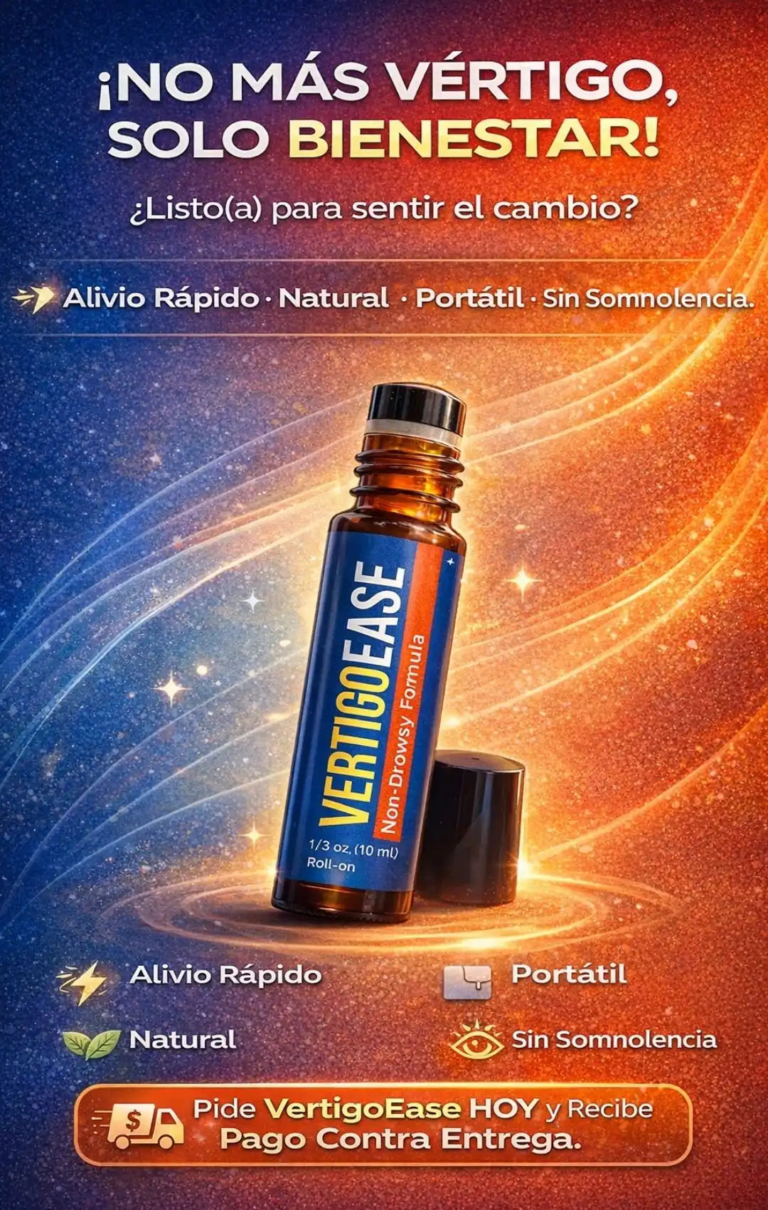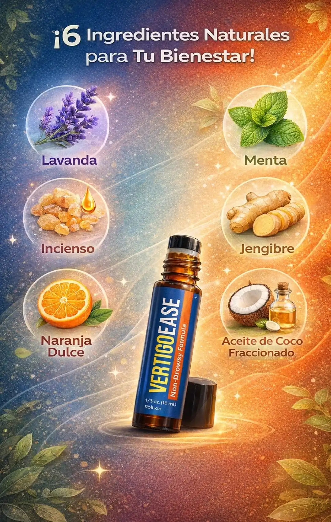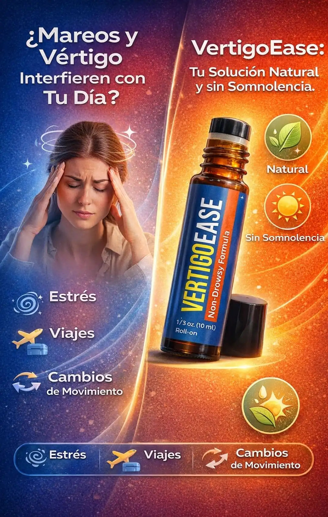 VertigoEase es un roll-on natural diseñado para ayudar a aliviar el vértigo y los mareos de forma rápida y sin causar somnolencia.