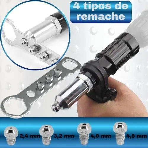 Viene con llave de ajuste y boquillas para remaches de 2.4mm, 3.2mm, 4.0mm y 4.8mm.